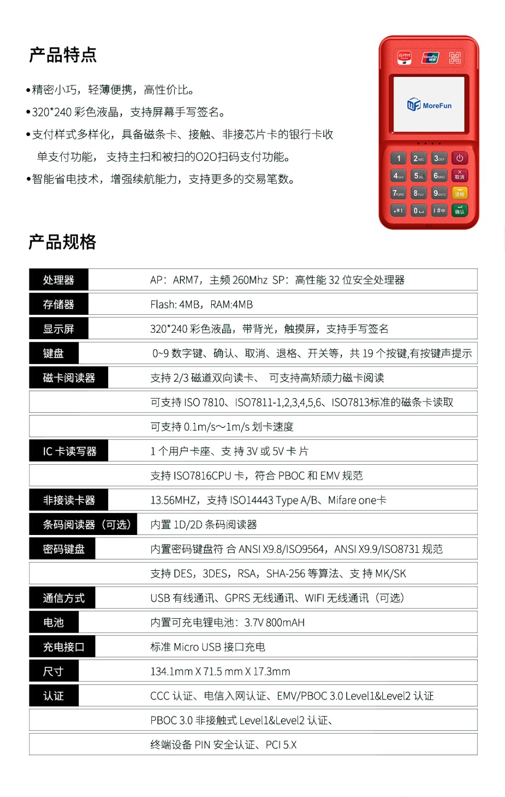 首页>>古冶产品中心>>古冶手持无线POS 古冶联动优势-优POS Pro 高配版 * 性能优越:32位高性能ARM11安全CPU;整机通过业内更先进的PCI PED4.X 安全认证及国内受理终端PIN输入设备安全评估检测认证,多项措施保障金融交易的安全;* 时尚外观:外形小巧携带方便,高抗跌落性能、宽工作温度、防水防尘设计、外壳坚固耐刮、户外携带式作业更加耐久可靠。* 通讯备份:支持2G-3G扩展;* 超长续航:3.7V-800毫安稳定续航能力,智能电池管理保证持续工作18小时,待机72小时。 标准配置 返 回